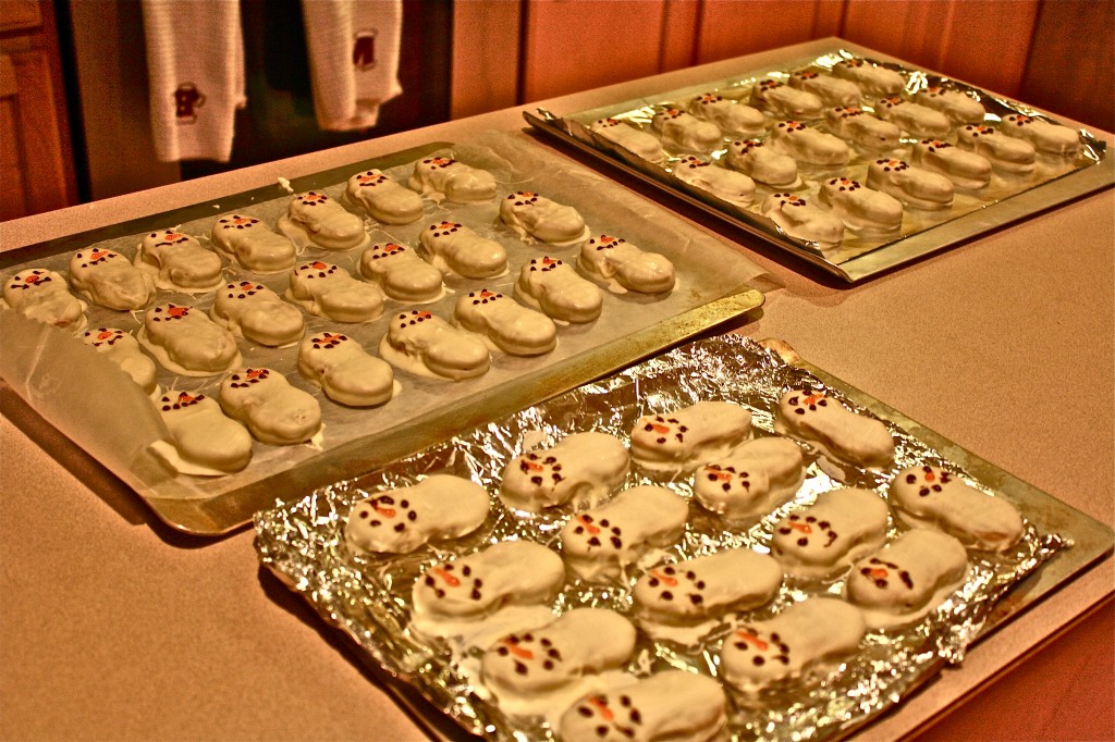 I went to a cookie exchange with some fellow JAG wives and I made these adorable little dudes. Just melt a ridiculous amount of white chocolate, dip some NutterButters in it, and then decorate with chocolate and orange icing! GET IN MY MOUTH SNOWMAN!